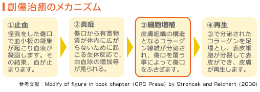 ■古の知恵の結晶、卵殻膜には傷を綺麗に治す効果がある! 傷の治癒には「止血」「炎症」「細胞増殖」「再生」という4つの過程が存在します。とりわけ「細胞増殖」期間は重要で、ここでの細胞分裂が活発でないと傷がキレイにふさがりません。この点に着目し、近年市販された絆創膏には傷を湿潤な状態に保つことで「細胞増殖」期間を長引かせ、傷を綺麗に治そうとする商品もあります。卵殻膜の作用もこれと似ていますが、さらに細胞増殖と関係し、傷を治そうとする働きがあります。