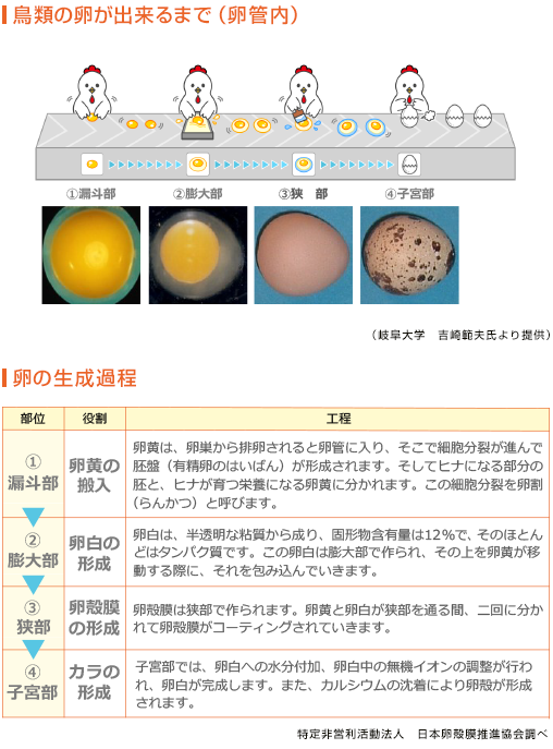 鶏卵は、まず卵黄が卵巣でつくられ、それが排卵されると、卵管と子宮を経つつ形成されます。この過程が実に巧妙で、ベルトコンベアーにでも運ばれるようにして卵管の中を移動しながら、さながら卵の製造工場のようにいくつかの段階を経て卵が完成されていきます。