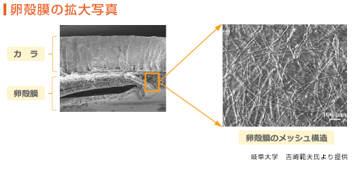 ■卵殻膜は頑丈なメッシュ構造 卵殻膜の主成分はタンパク質です。また、人の髪にも含まれるシスチンなども多量に含まれています。この卵殻膜自体は、卵黄と卵白を隔てる強い線維質の膜で、内膜(厚さ約0.05-0.07 mm)と外膜(厚さ約0.02 mm)と限界膜の3層からできています。内膜と外膜はどちらも線維が入り組んだメッシュのような構造になっています。その線維構造は、構成成分であるⅠ型、Ⅴ型、Ⅹ型コラーゲン、グルコサミン、デスモシン、ヒアルロン酸などがリシルオキシダーゼの働きにより互いに結合してできています。そのため、とても強固で熱にも強く、容易に消化出来ません。