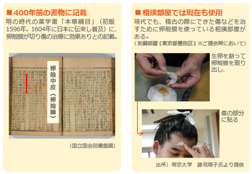 ■古の知恵の結晶、卵殻膜には傷を綺麗に治す効果がある! 傷の治癒には「止血」「炎症」「細胞増殖」「再生」という4つの過程が存在します。とりわけ「細胞増殖」期間は重要で、ここでの細胞分裂が活発でないと傷がキレイにふさがりません。この点に着目し、近年市販された絆創膏には傷を湿潤な状態に保つことで「細胞増殖」期間を長引かせ、傷を綺麗に治そうとする商品もあります。卵殻膜の作用もこれと似ていますが、さらに細胞増殖と関係し、傷を治そうとする働きがあります。