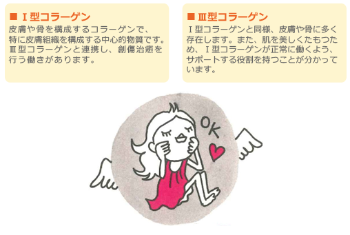 人の体内には約20種類以上のコラーゲンがあり、それぞれ分布する箇所や機能が異なります。その中でも、皮膚や骨に多く含まれるⅠ型コラーゲンやⅢ型コラーゲンは美しい肌を創るために必要不可欠なものと言えます。